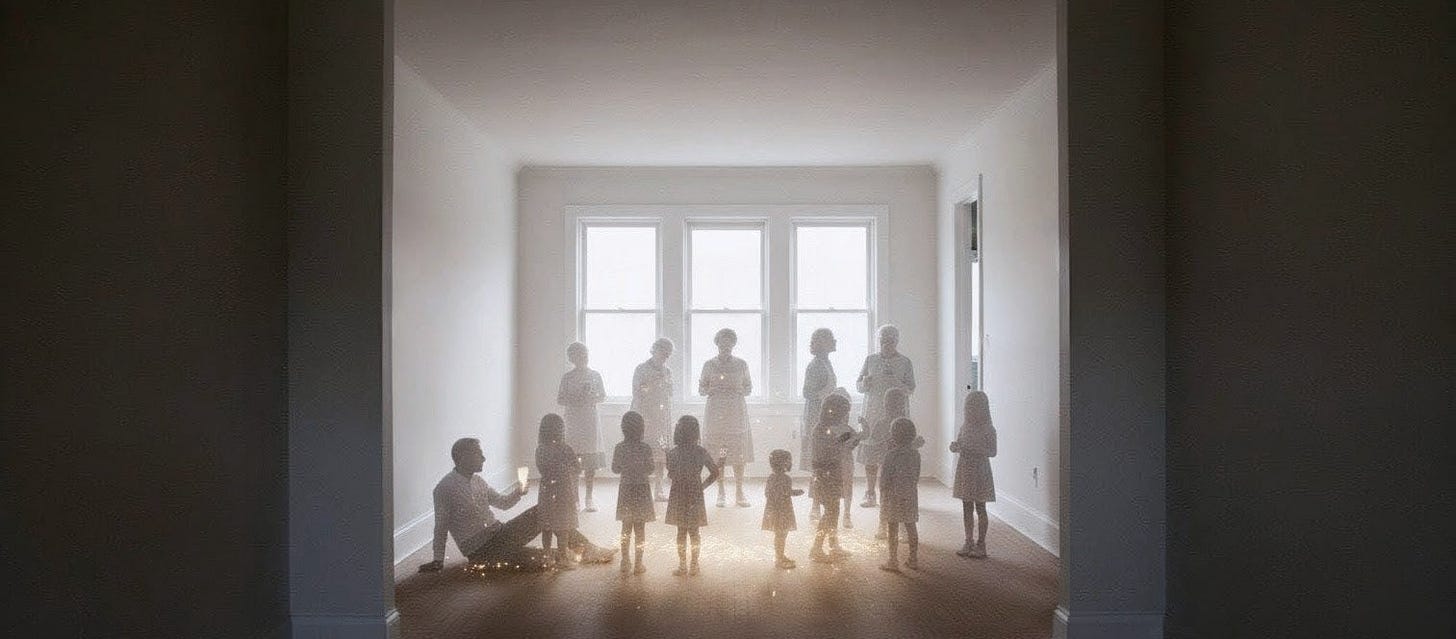 The house was bare, painted fresh— though dated still. Silent— thick with memory. Decades collapsed. The dining room bustled: gifts on the table, the slap of cards— a poker game. Mother in the kitchen, trays of rolls cooling. Father in the living room— stretched on the floor, whisky in hand, watching the game. Every seat full. Laughter. Fighting. Children— covering the floor, cradling their toys— joined by the ones who came before them, a crowded lineage huddled in the hollow light. So full of life. Now still. Now empty. Nowhere for all the love to go.